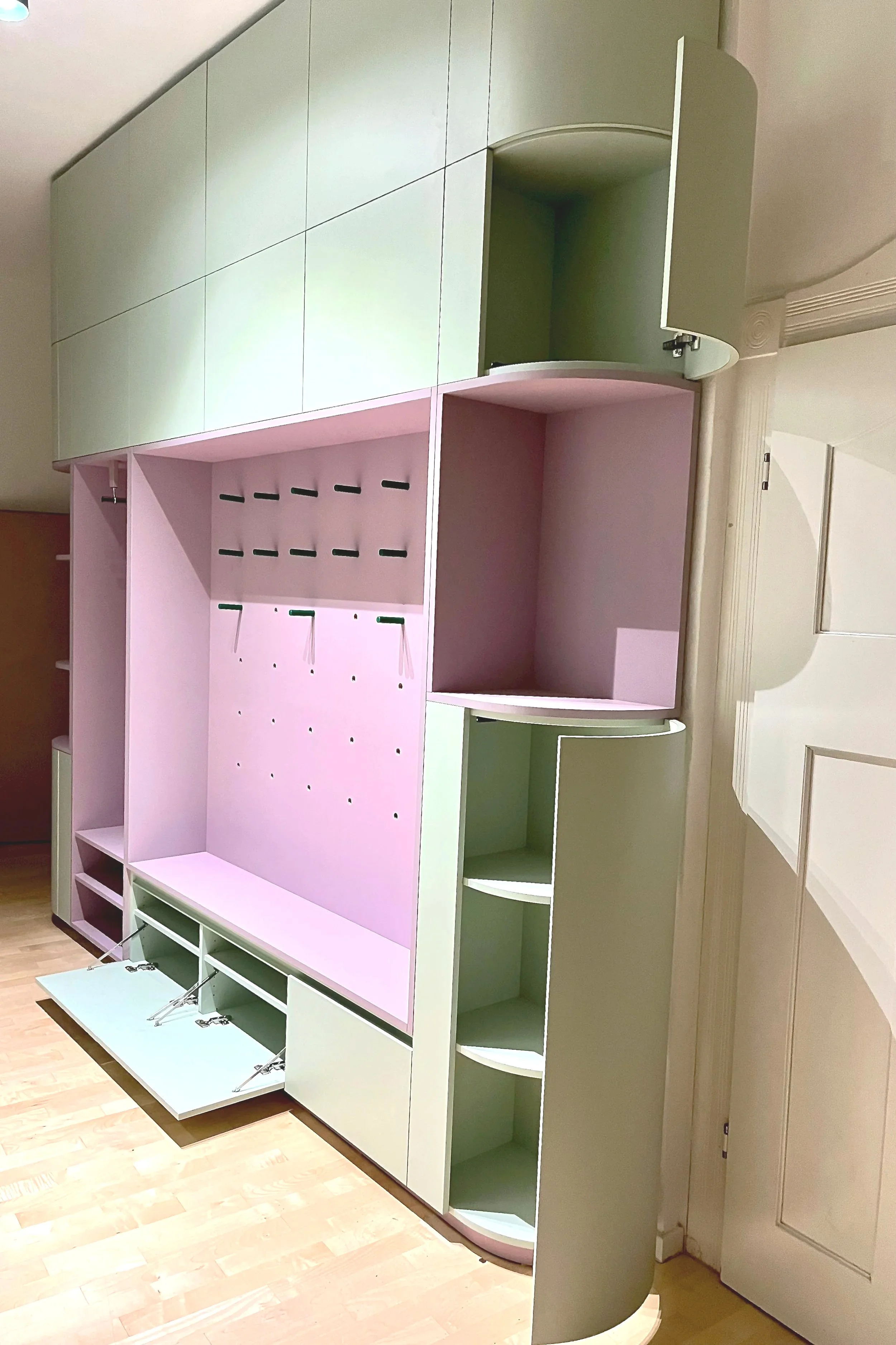 Zwei maßgefertigte Einbauschränke mit abgerundeten Ecken in salbeifarbenem Dekor, Nischen in fliederfarbenem Linoleum. Integrierte Pegboard-Wand als Garderobe mit Sitznische. Design & Entwurf: Innenarchitekturbüro Habitiny – wir als ausführendes Gewerk.